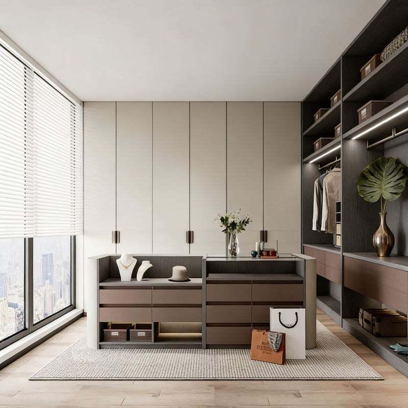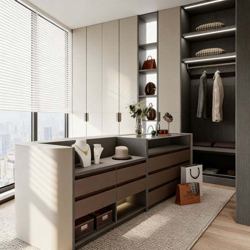 Dressing moderne de luxe en forme de L avec finition en bois blanc crème et foncé, rangement intégré, zone de suspension et meuble-lavabo