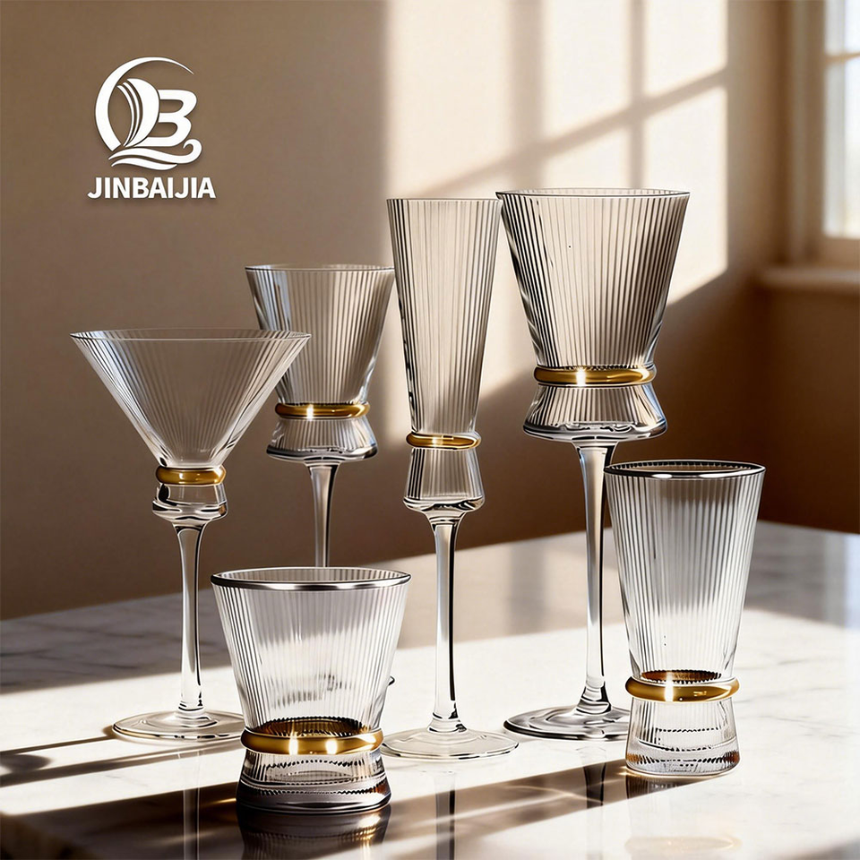 Ensemble de verres à vin en cristal côtelé de luxe moderne, design ceinture dorée, flûte à champagne, coupe à martini pour mariage, banquet, hôtel