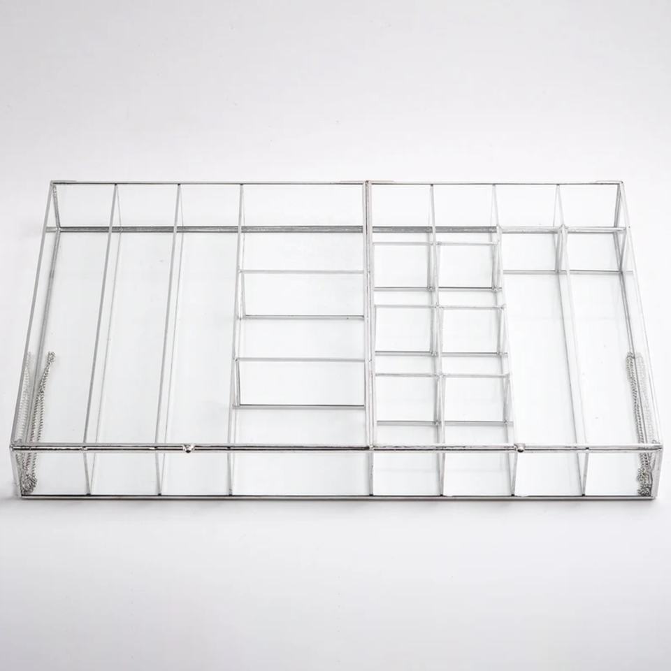 Boîte de rangement compartimentée moderne et personnalisable en acier inoxydable et verre, idéale pour bijoux, cosmétiques et décorations – Meilleure vente