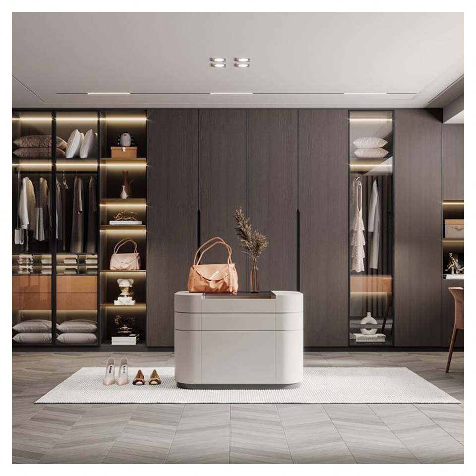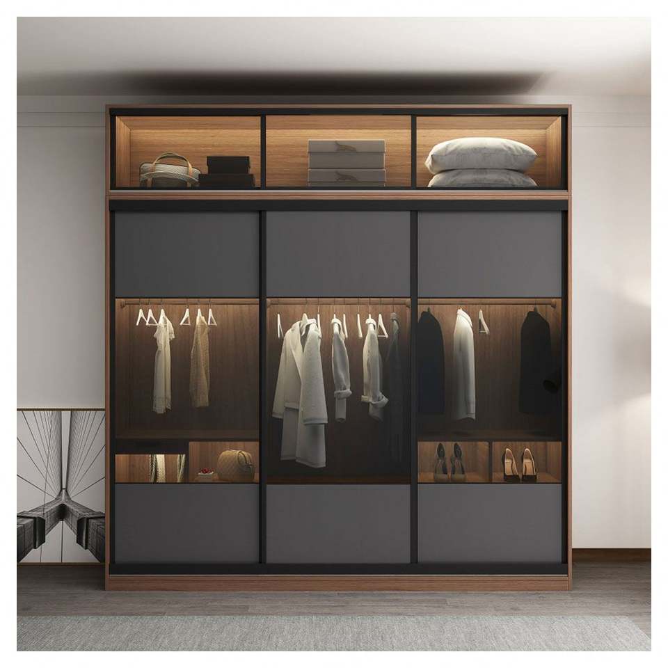 Système de placard de chambre à coucher avec portes d'affichage noires mates modernes, cadre en acier inoxydable, placard mural multifonctionnel avec étagères en verre