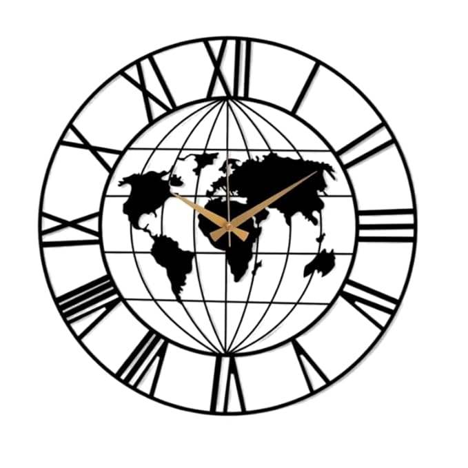 Horloge murale métallique Carte du monde mondial, design Atlas de la Terre, thème voyage, contours des continents, pour espace de travail professionnel international
