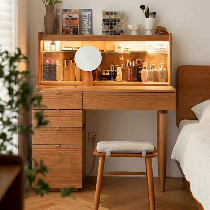 Table de toilette moderne et minimaliste en bois de cerisier massif avec éclairage intégré