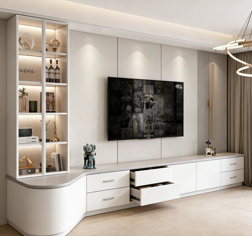 Modern Minimalist Integrated TV Stand - Sleek Living Room Furniture with LED Lighting & Glass-Door Storage Organization