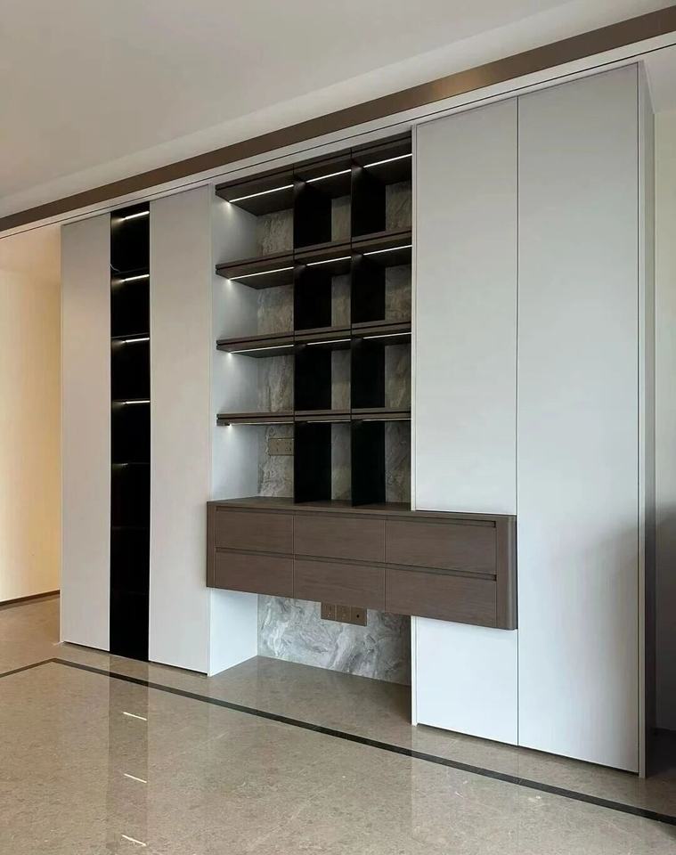Système de garde-robe moderne et minimaliste, portes coulissantes pleine hauteur, rails dissimulés, vitrine intégrée