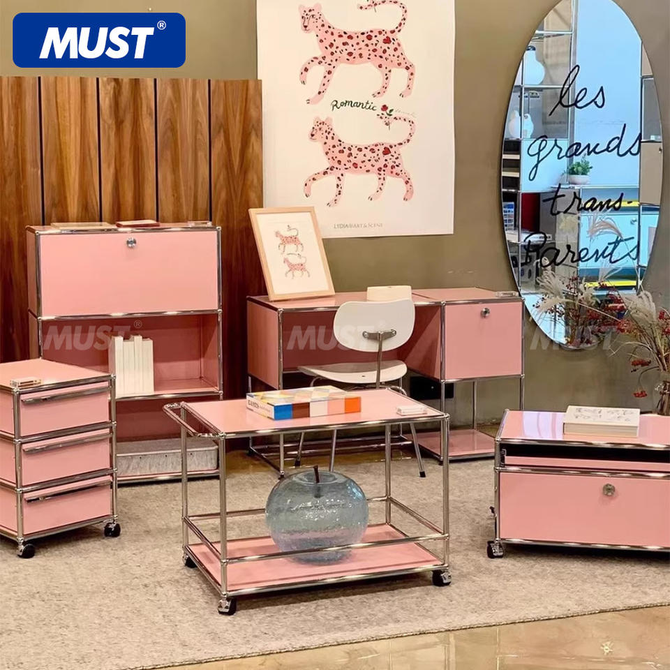Table de toilette moderne modulaire, librement combinable, en acier inoxydable ; personnalisable de manière flexible pour les chambres et les salons