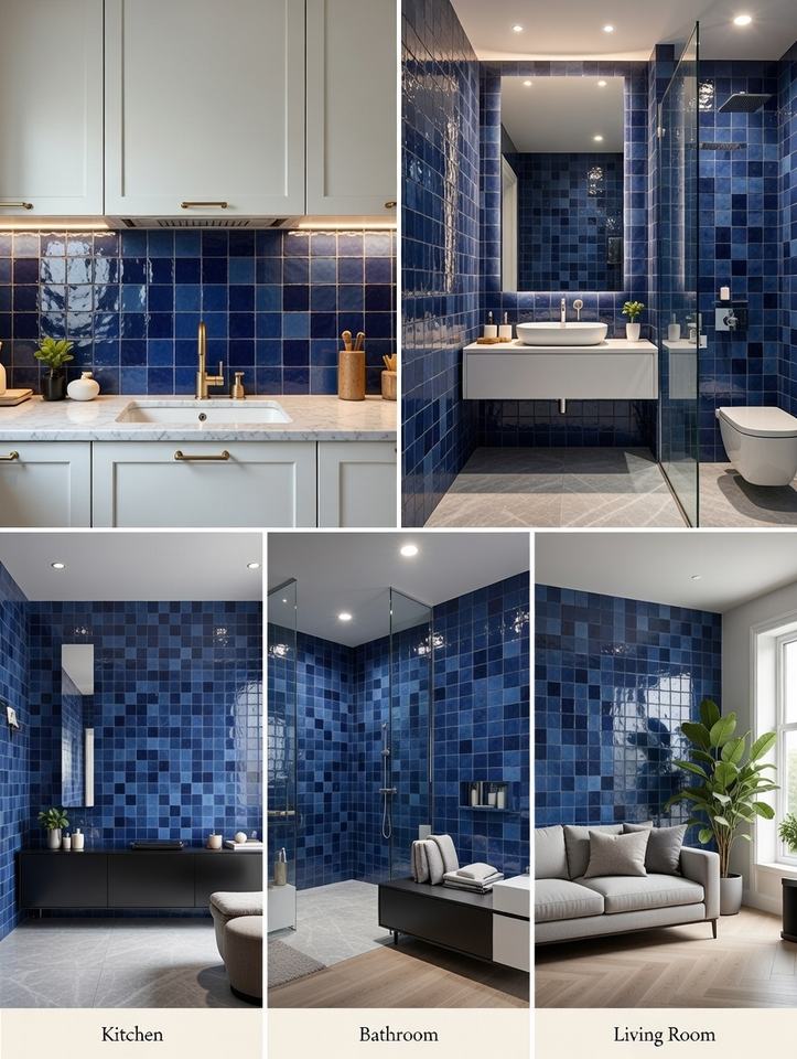 Carrelage mural en céramique bleue marocaine moderne 100x100mm, finition rustique brillante pour utilisation intérieure dans le salon