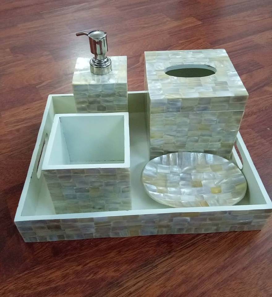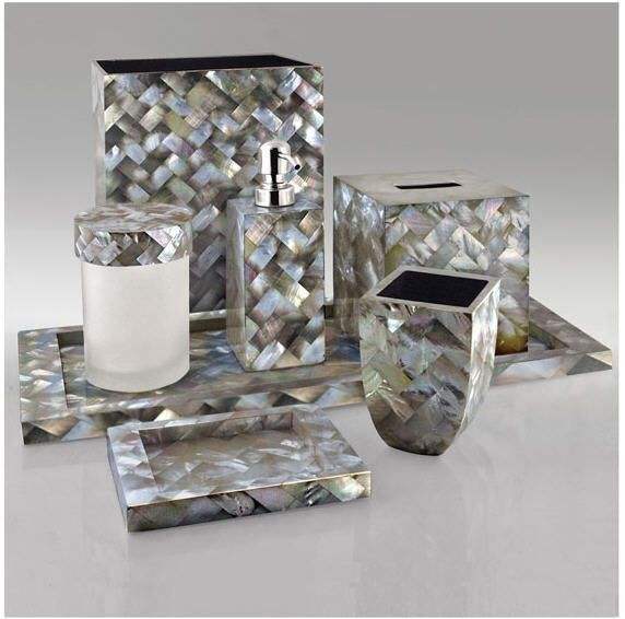 Ensemble d'accessoires de salle de bain de luxe en métal moderne, cinq pièces, écologique, pour une présentation de vanité sublimée, inspiration côtière charmante