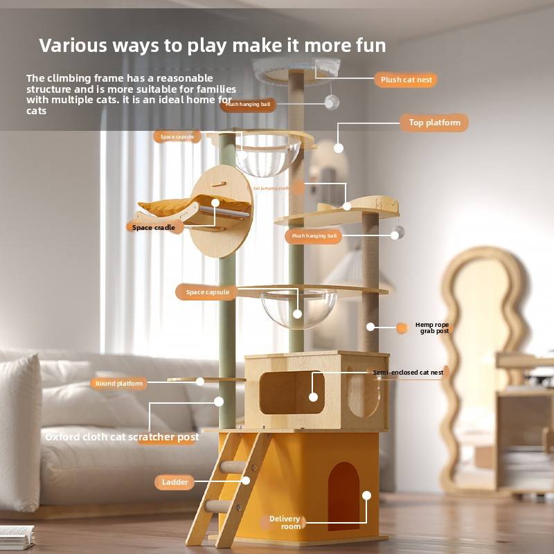 Arbre à chat moderne multi-niveaux avec structure en bois, capsules spatiales et hamac pour chats d'intérieur
