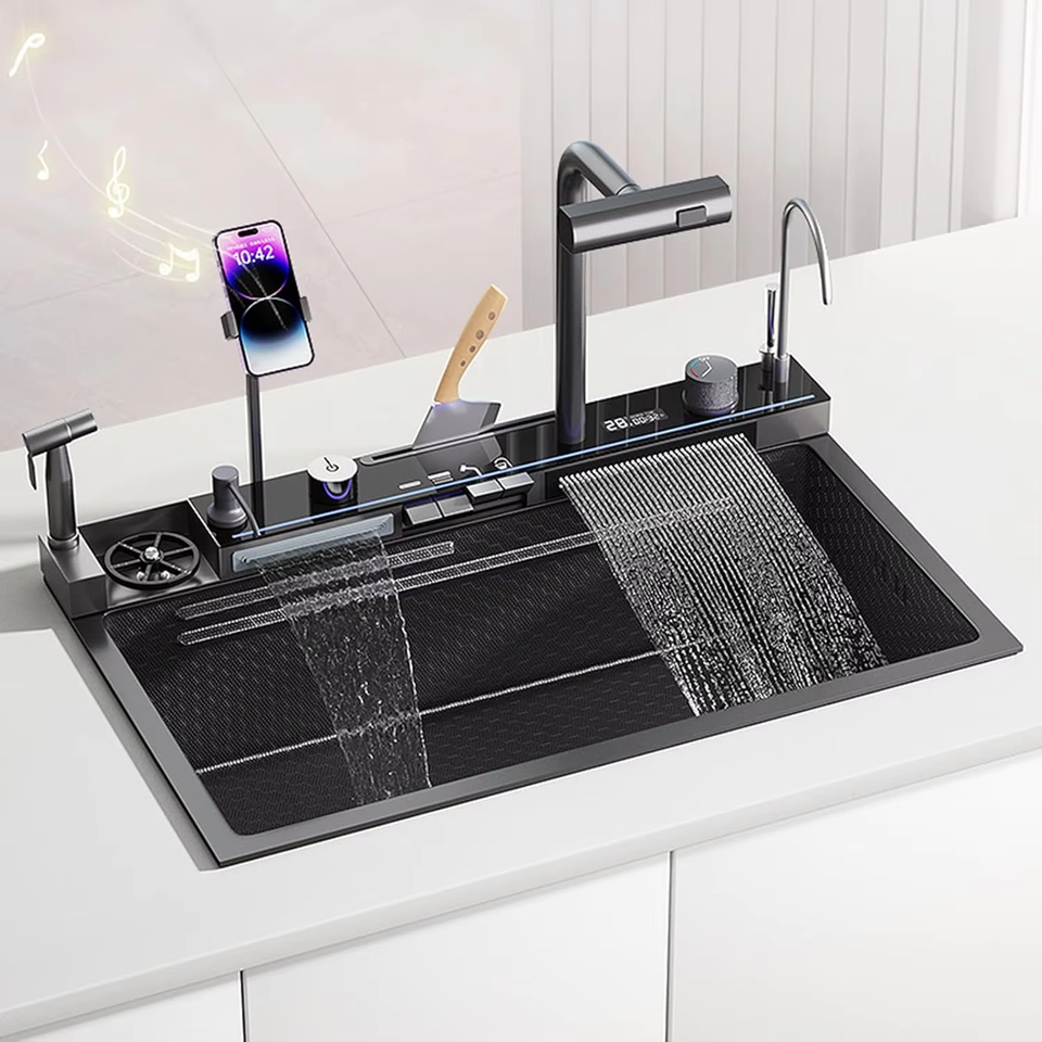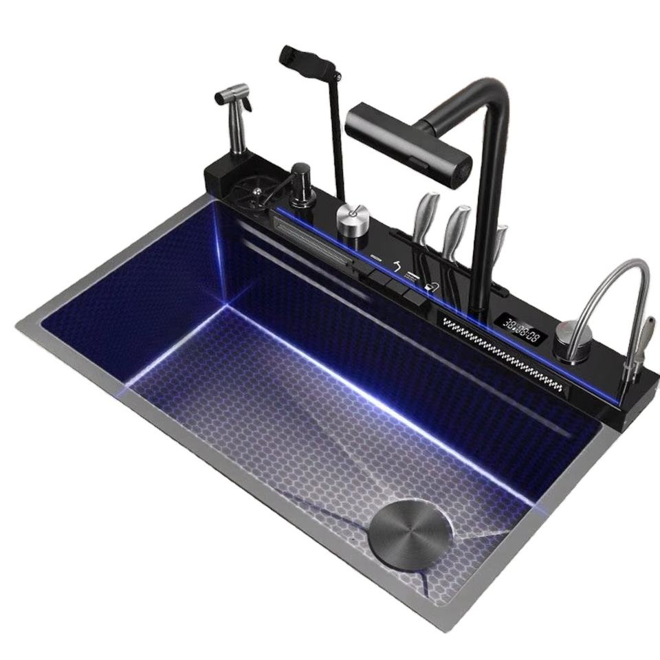 Évier de cuisine multifonction moderne en acier inoxydable Évier de cuisine profond avec passoire avec étagère pour téléphone portable