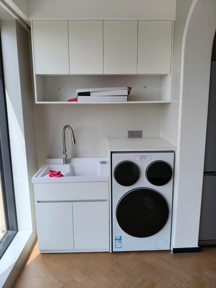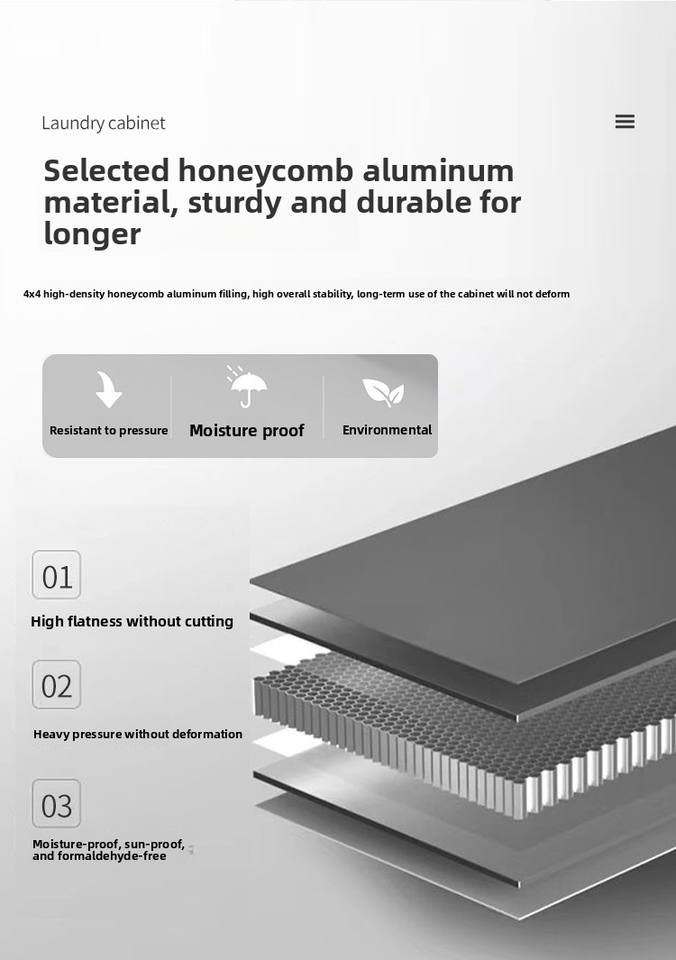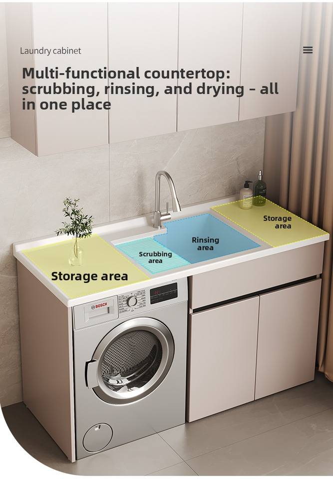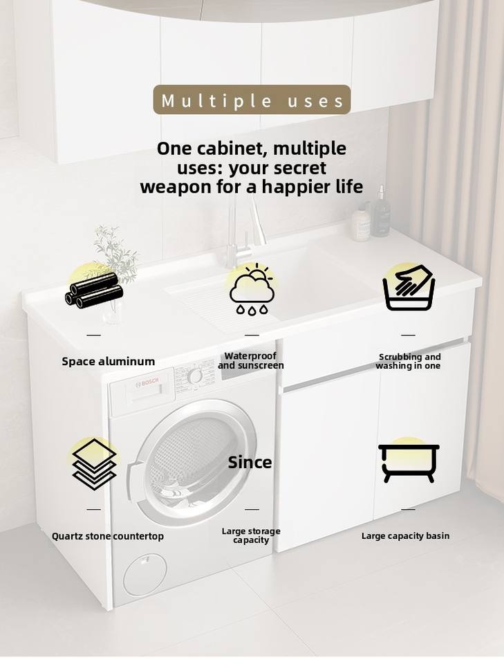 Meuble de machine à laver multifonctionnel intégré moderne avec lavabo en pierre de quartz et balcon en aluminium alvéolé