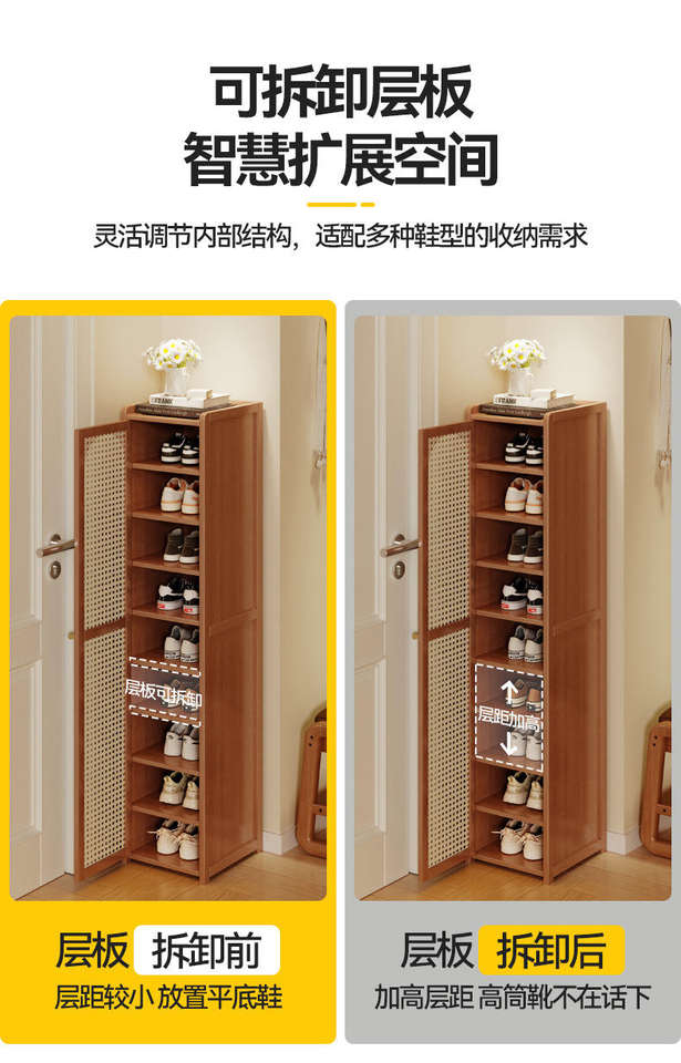 Étagère à chaussures moderne étroite multi-niveaux anti-poussière pour usage domestique et commercial (centre commercial/entrepôt) en bambou et MDF, 7 étagères