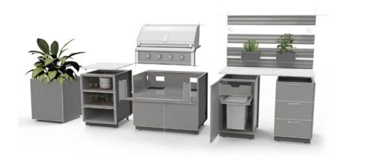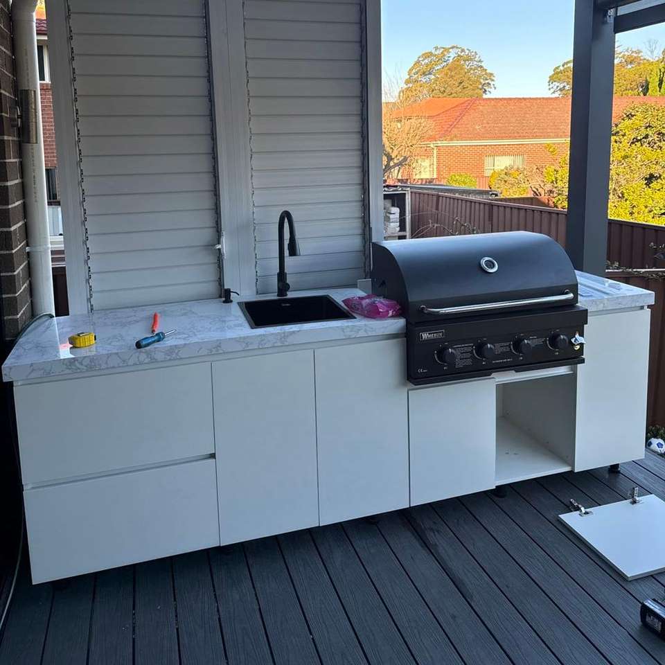 Cuisine extérieure moderne avec évier, porte en PVC, four à pizza, petit réfrigérateur, armoire de cuisine, panier et autres meubles de cuisine