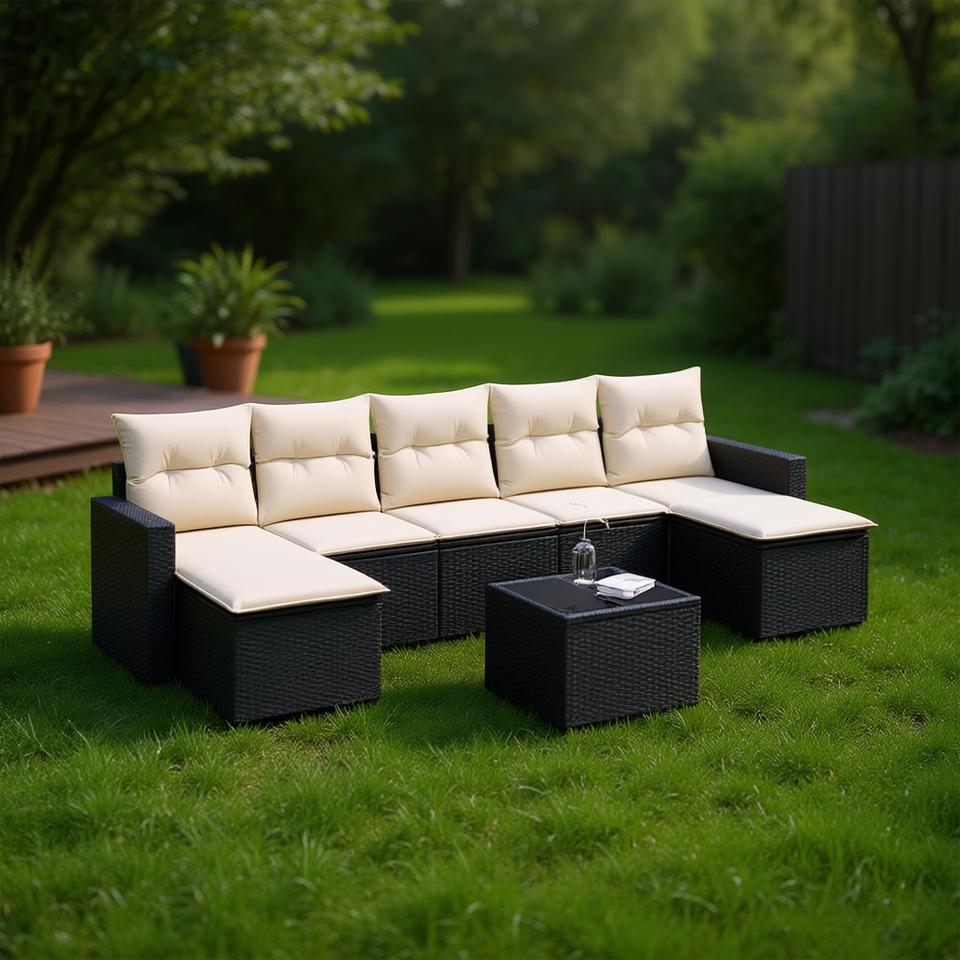 Modern Outdoor Rattan Sofa Set With Cream Cushions Black PE Woven Garden Furniture Waterproof Contemporary Design