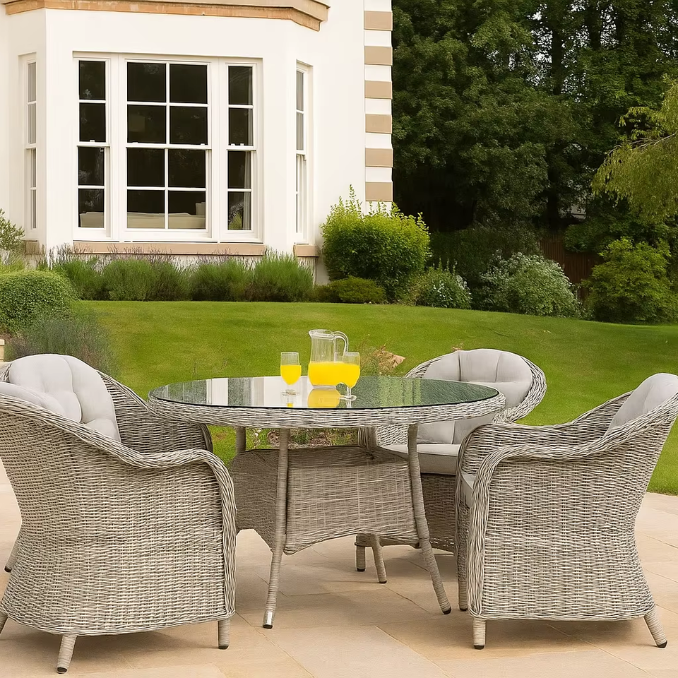 Ensemble de salle à manger moderne pour patio, 4 chaises et table ronde en verre, meubles en rotin PE résistant aux intempéries pour cour et espaces extérieurs d'hôtel