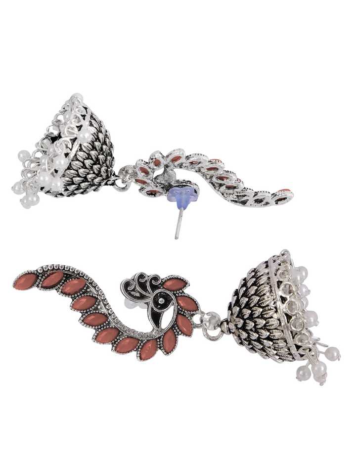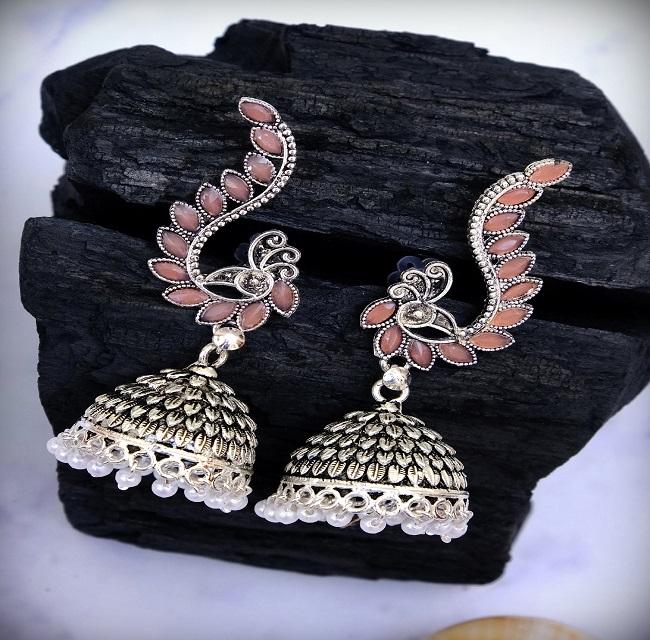 Product Name:Pink Peacock Design Jhumka Earrings Good Quality Oxidised Silver