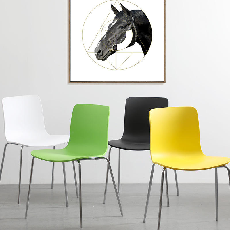 Chaise de salle à manger moderne en plastique avec pieds électroplaqués, empilable, pour la maison, le bureau, les cafés, disponible en noir, blanc, jaune, vert, rouge, bleu