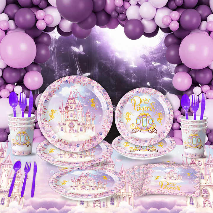 Nouveauté : Thème Château Violet Moderne – Vaisselle et Nappe de Fête d'Anniversaire pour Enfants et Fournitures de Décoration d'Anniversaire pour Bébés
