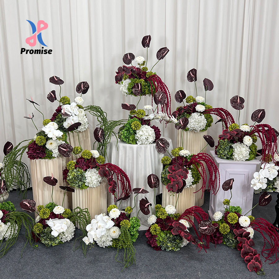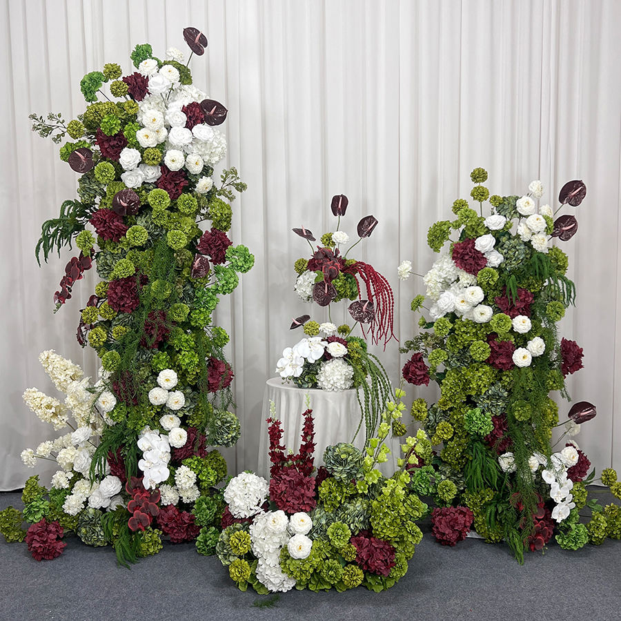 Composition florale artificielle moderne et réaliste en soie rouge et verte pour décoration de toile de fond de mariage
