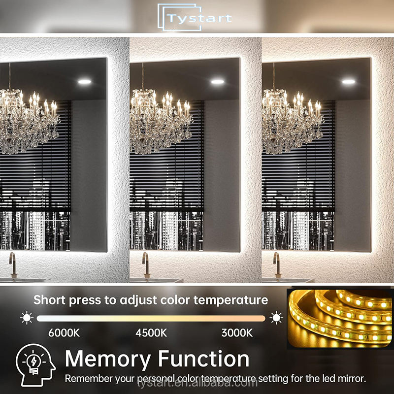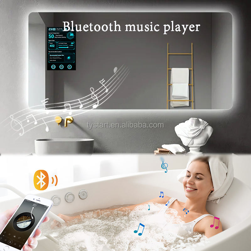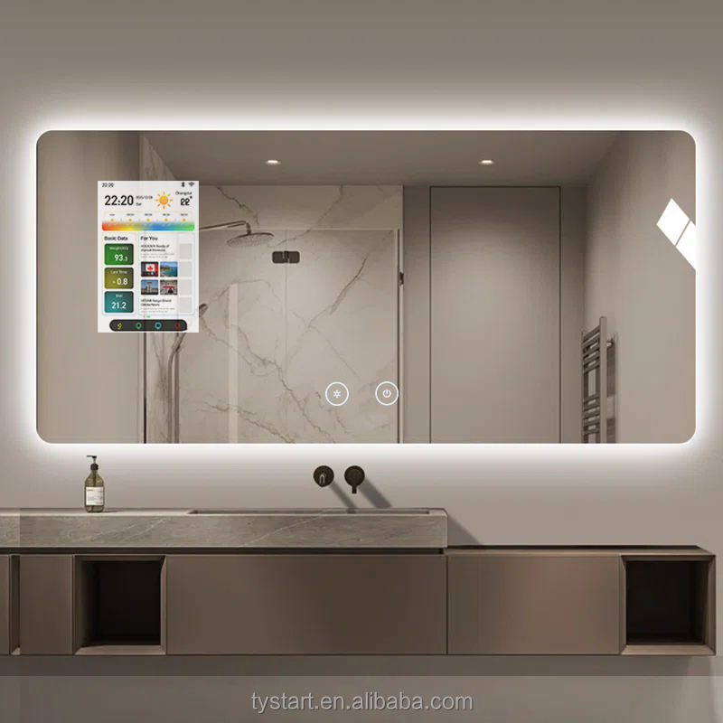 Miroir de salle de bain intelligent rectangulaire moderne éclairé avec écran tactile TV, anti-buée, Bluetooth/Wi-Fi/Android, design graphique, 220V