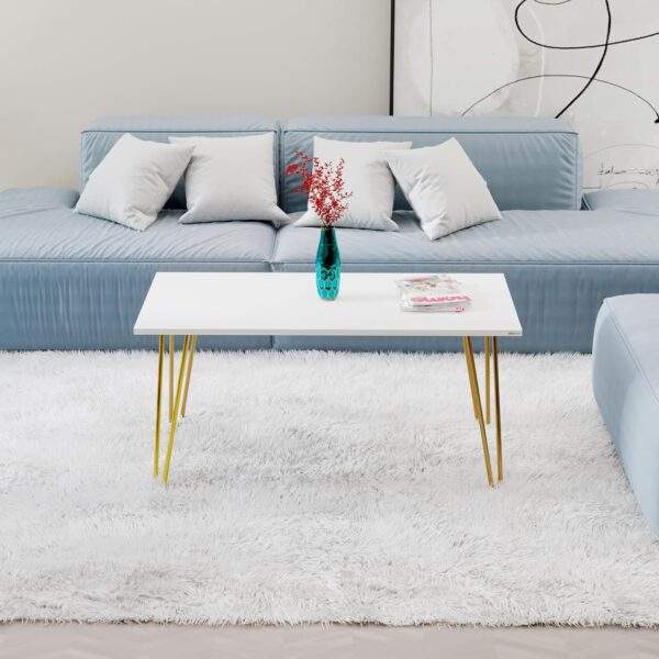 Table basse rectangulaire moderne avec plateau blanc et pieds en métal doré