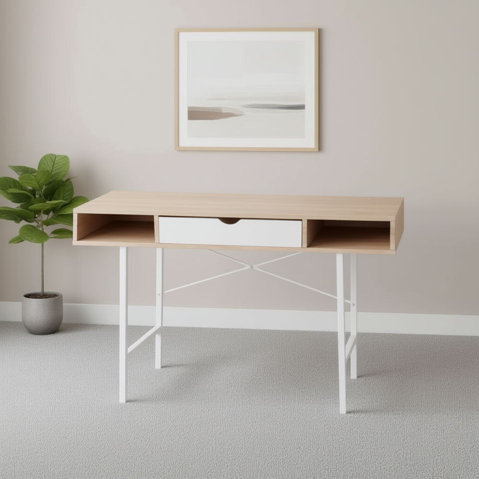 Bureau d'ordinateur rectangulaire moderne en chêne avec pieds en métal, taille moyenne, mobilier de bureau à domicile