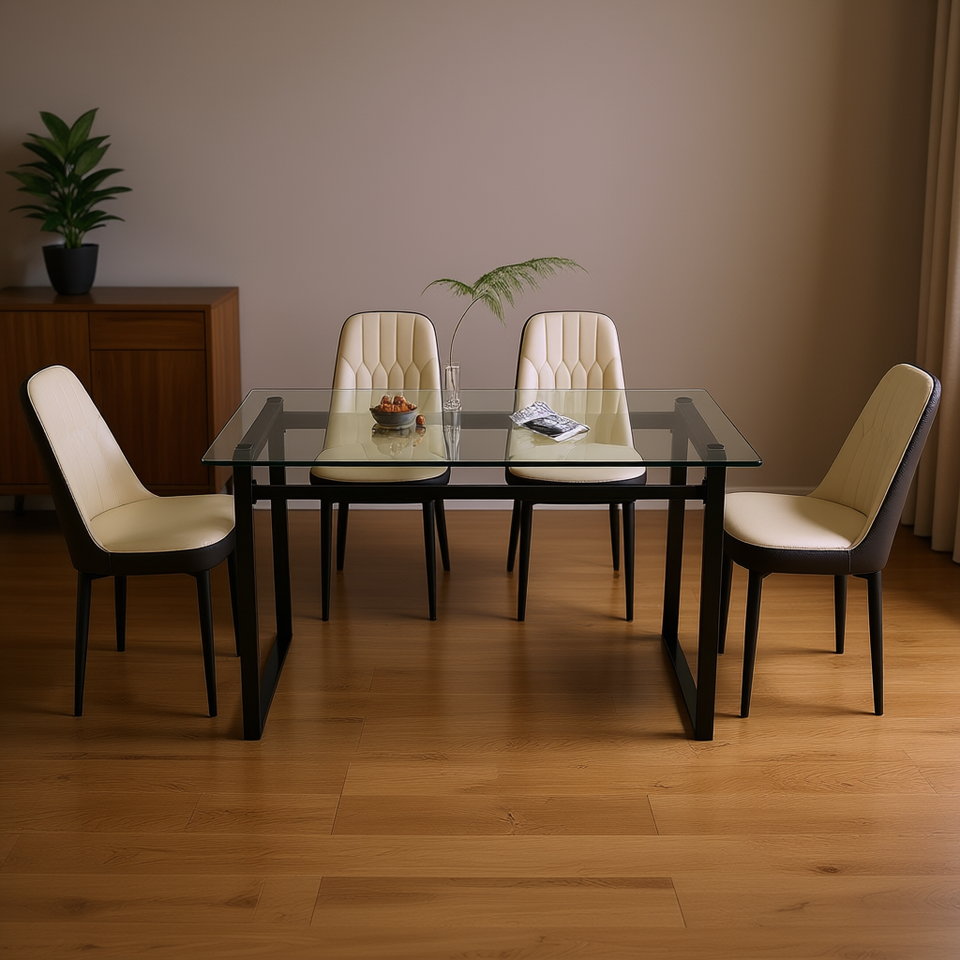 Ensemble de table à manger rectangulaire moderne en verre trempé, 4 pièces, pieds en métal noir, chaises en PU rembourrées épaisses, meubles de salle à manger