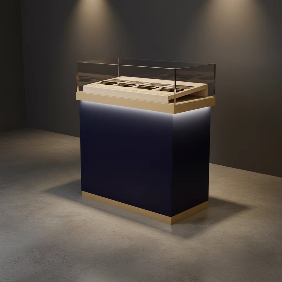 Comptoir de présentation moderne pour le commerce de détail, vitrine à plateau en verre, table avec éclairage LED, base en bois, armoire de rangement pour bijouterie, magasin d'optique