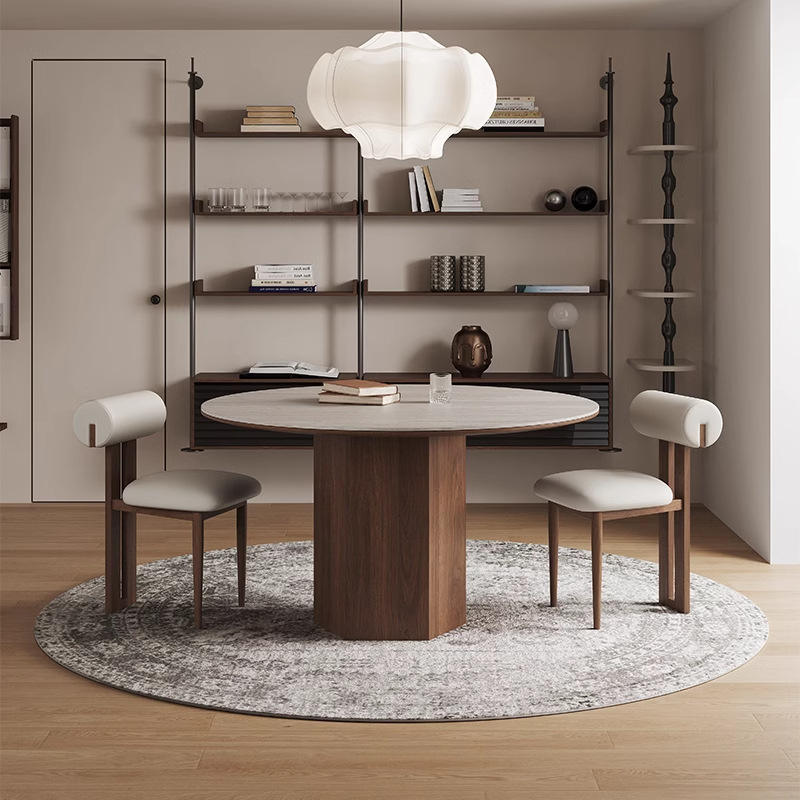 Modern Retro Style Solid Wood Extendable Round Dining Table Set with Rock Slab Top and Chairs Set Dining Room Furniture