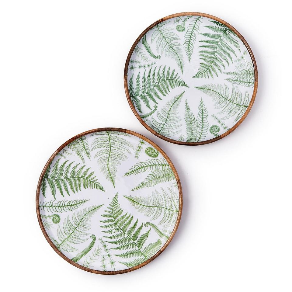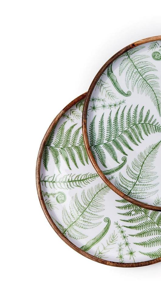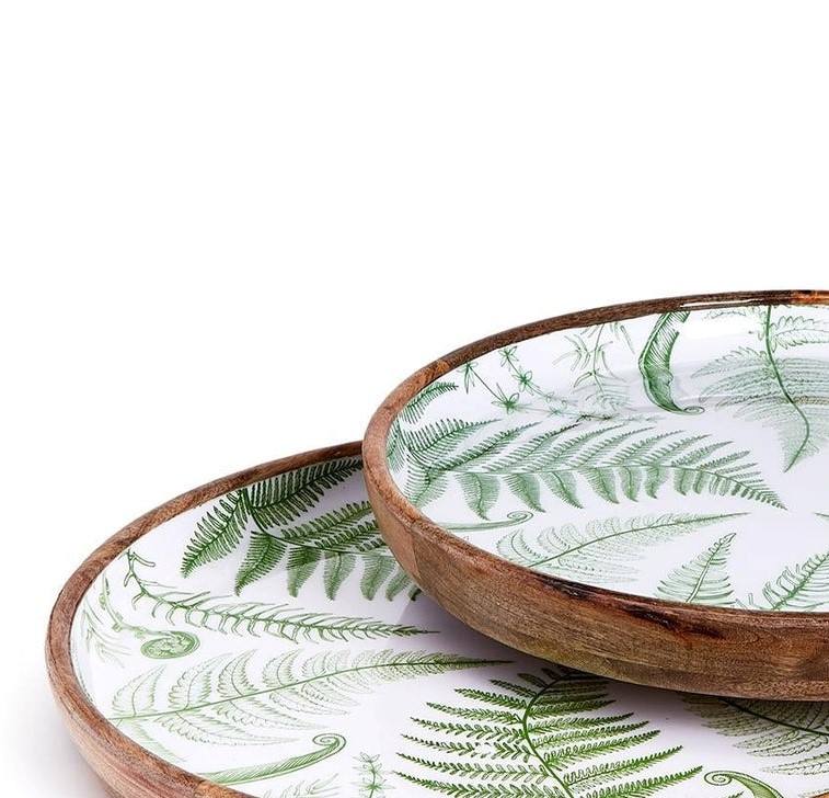 Ensemble de plateaux de service ronds modernes en bois de manguier avec impression émaillée de feuille de fougère verte, plateaux en bois décoratifs pour la cuisine et la salle à manger