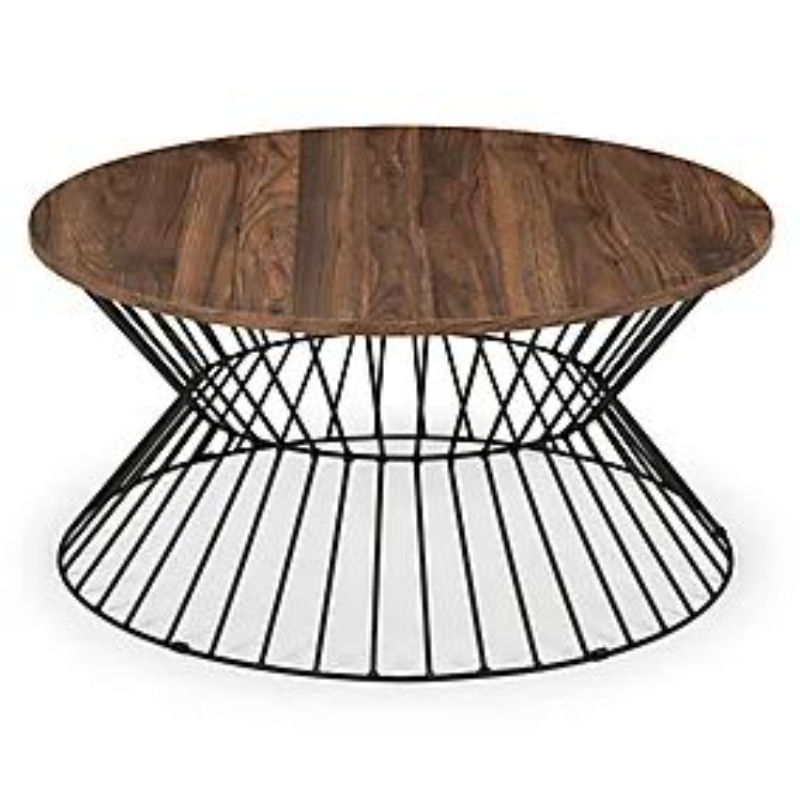 Table basse ronde moderne en bois avec structure métallique, table centrale de salon style ferme avec pieds métalliques robustes, meuble