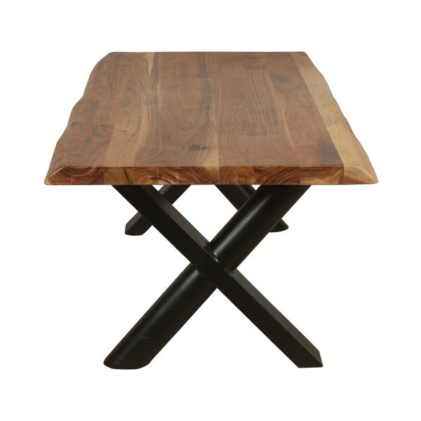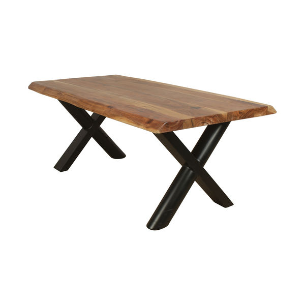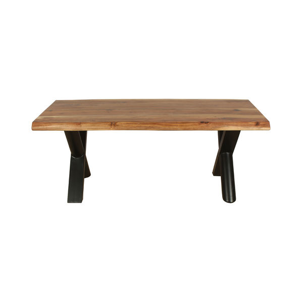 Table basse rustique moderne en bois massif avec bord naturel et base en fer noir, robuste et durable