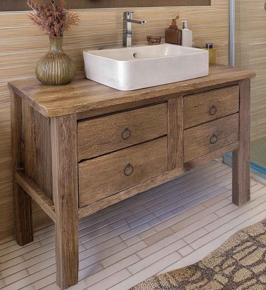 Meuble de salle de bain moderne rustique en bois massif avec vasque intégrée et quatre tiroirs de rangement