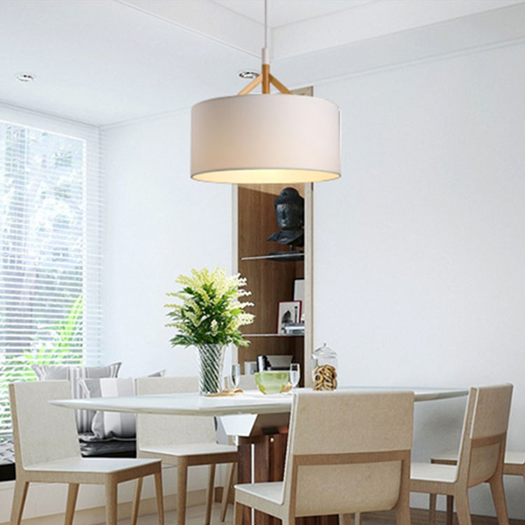 Modern Scandinavian Fabric Drum Pendant Light Fixture Nordic Wood Ceiling Hanging Lamp E27 Chandelier for Home Decor Lighting