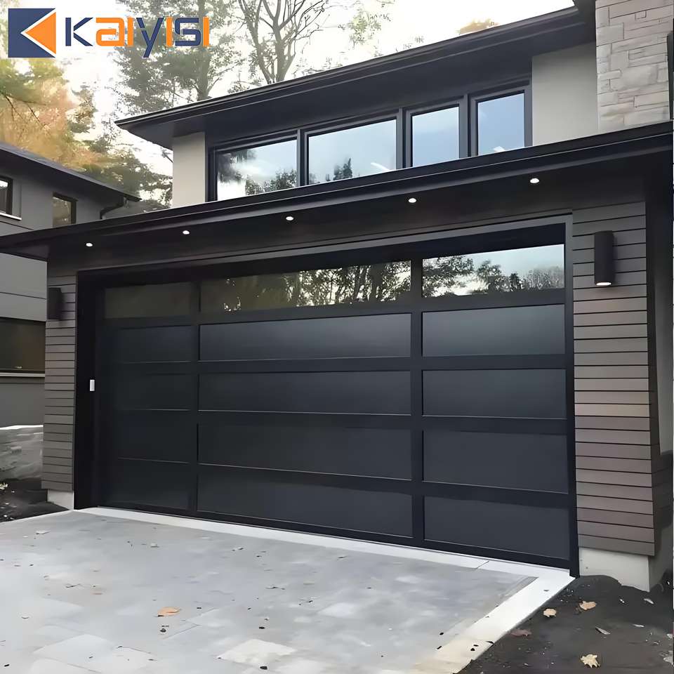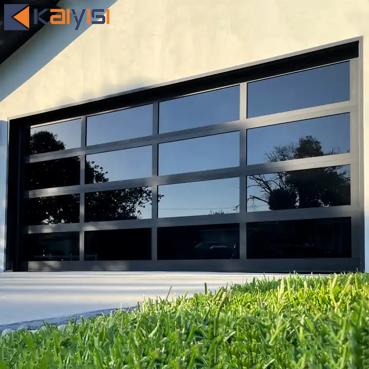 Porte de garage moderne à panneaux sectionnels, vue panoramique, résistante aux chocs, en verre trempé