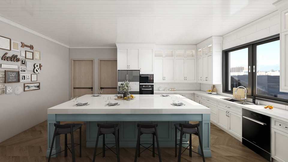 Cuisine moderne de style shaker, armoires complètes, moulures de plafond avec éclairage