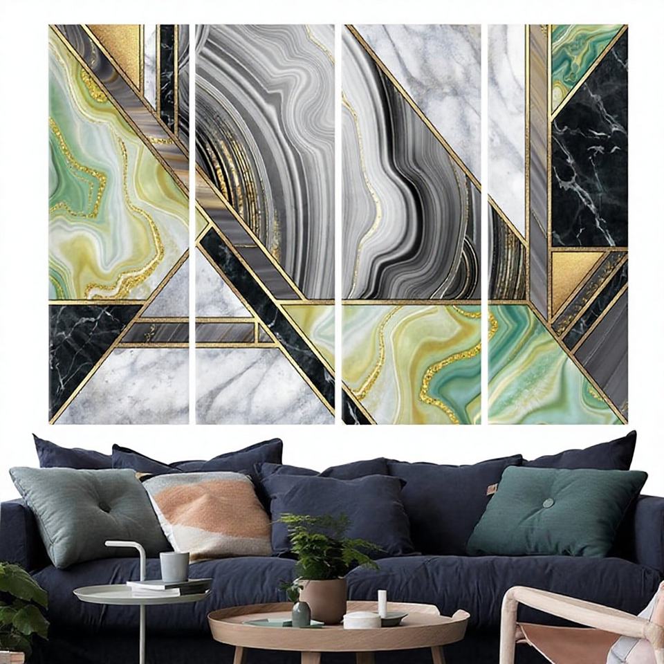 Impression sur toile moderne scintillante style Art Déco - Paysages, œuvre d'art à l'encre d'alcool, 4 pièces, encadrée et prête à accrocher