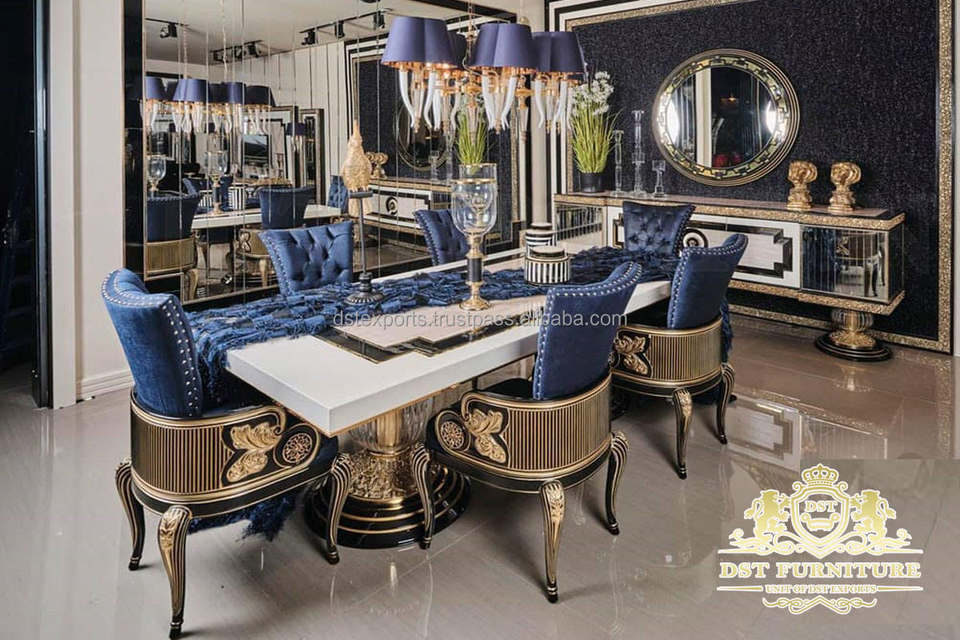 Ensemble de table à manger moderne en argent sculpté 6 places Table à manger et chaises coûteuses en finition blanche Table à manger en bois de luxe pour salle à manger