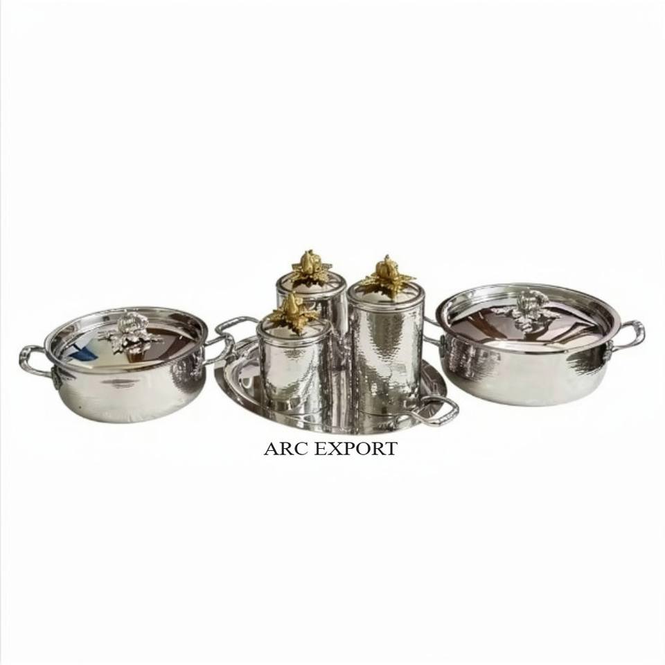 Ensemble de vaisselle décorative moderne finition argentée en acier inoxydable : casseroles, boîtes de rangement et plateaux de service pour mariage et décoration intérieure