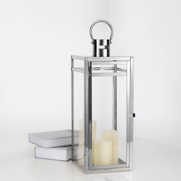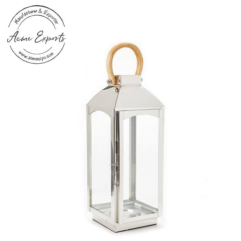 Lanterne moderne en métal argenté avec coupe géométrique, idéale pour l'éclairage des bougies, la décoration intérieure, le mariage et les événements extérieurs.