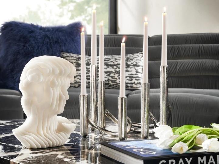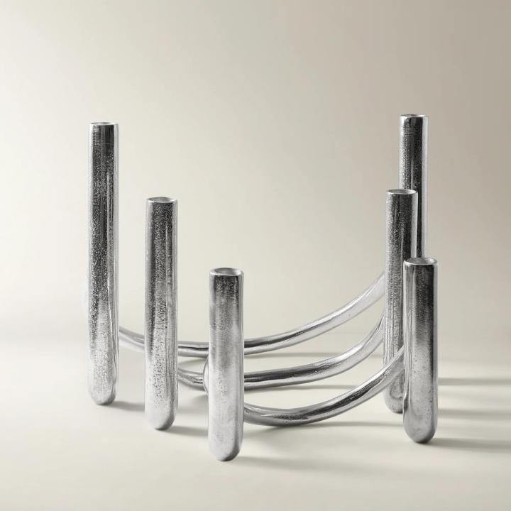 Candélabre moderne en métal argenté multi-bras, porte-bougies coniques à 6 lumières, centre de table abstrait incurvé pour décoration de table de mariage de luxe