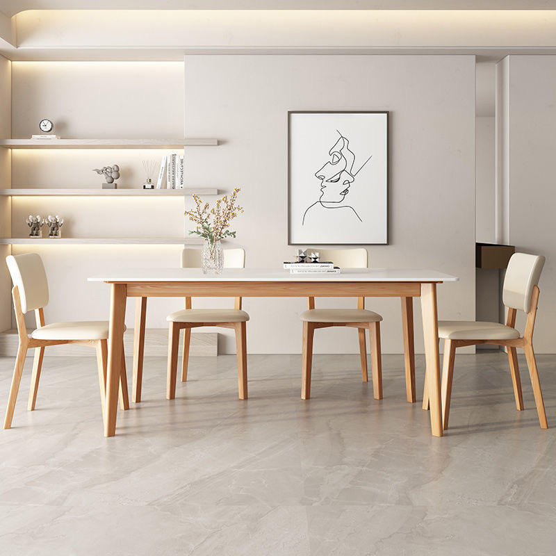 Ensemble de table à manger moderne et simple, plateau rectangulaire blanc avec pieds en bois, pour projet d'appartement, salle à manger.