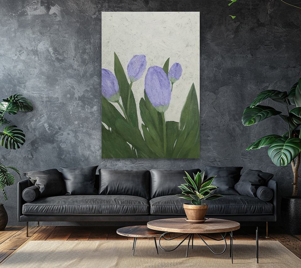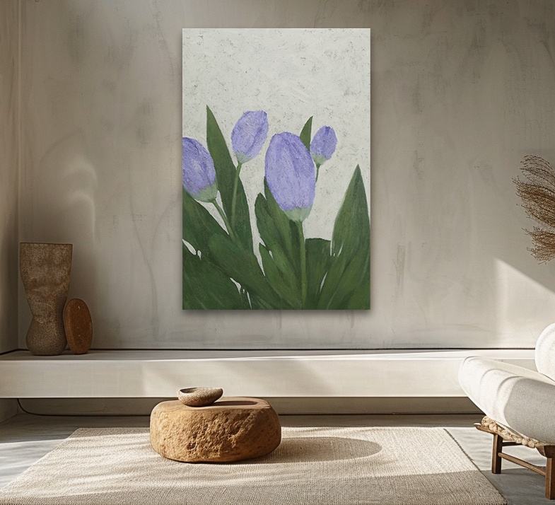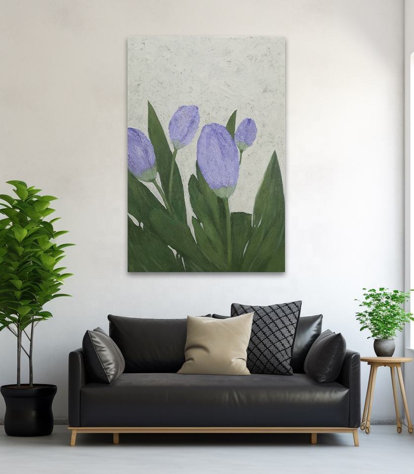 Moderne Simple Original Violet Tulipes Violet Fleur Feuille Verte Peint À La Main Texture Huile Épaisse Abstrait Salon Mur Art
