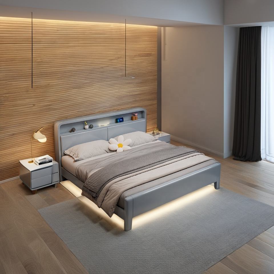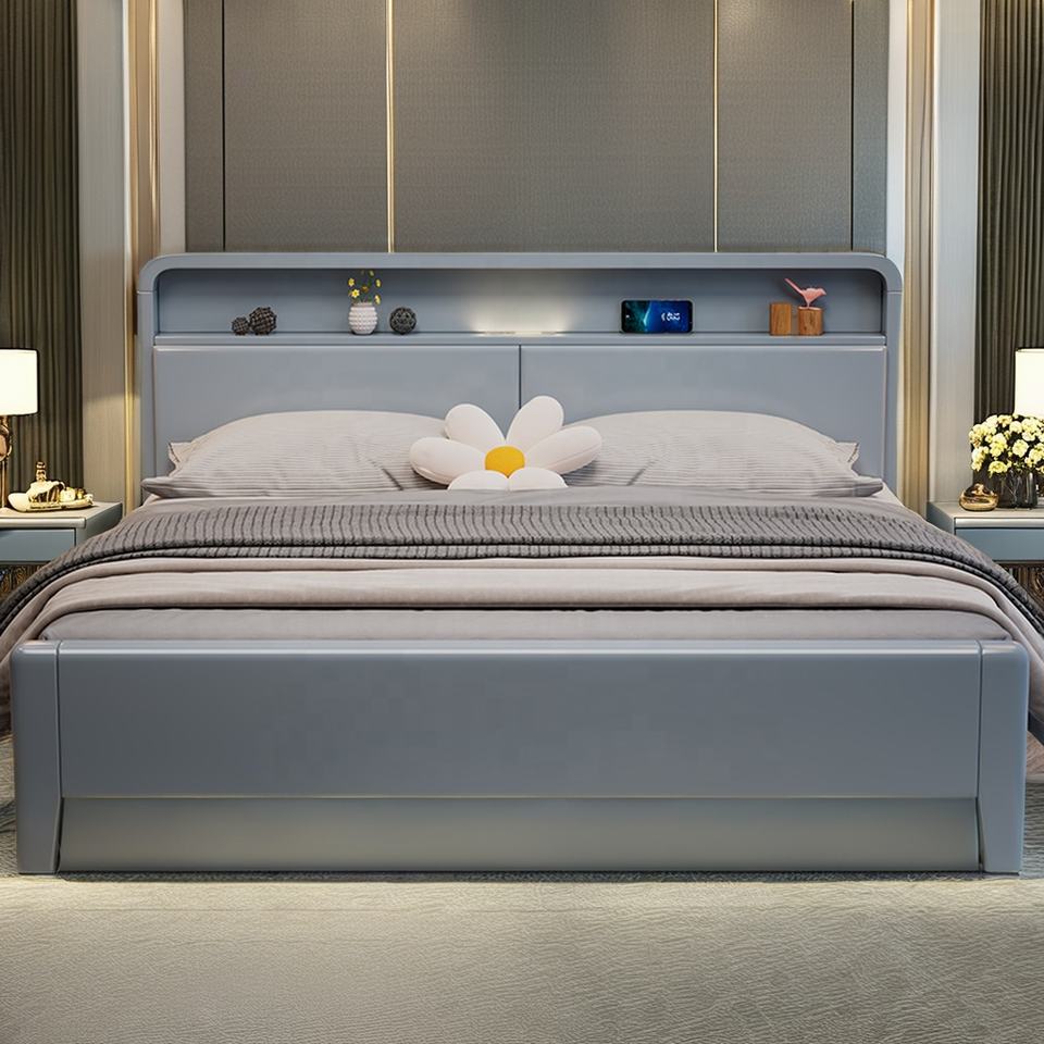 Lit simple moderne en bois avec rangement, grand lit double avec panneau en bois massif pour meubles de chambre d'hôtel et d'appartement