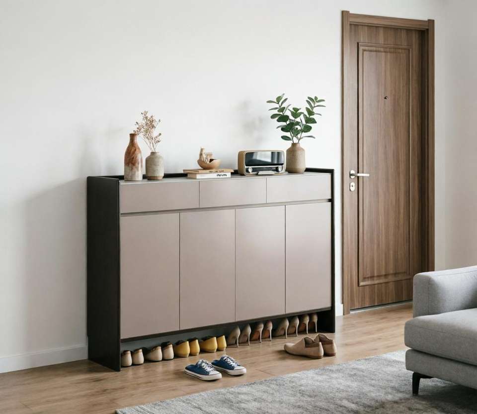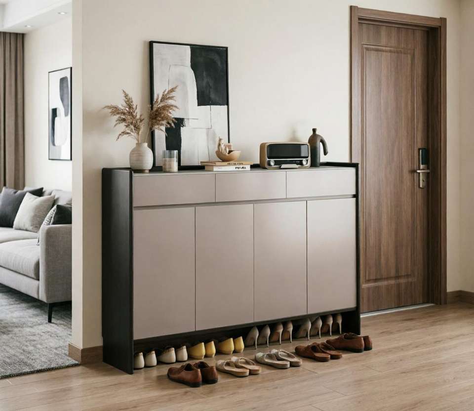 Meuble à chaussures moderne et mince, écologique et durable, avec rangement inférieur ouvert, organisateur d'entrée à 3 portes, finition beige et noir, gain de place, pour salle de sport