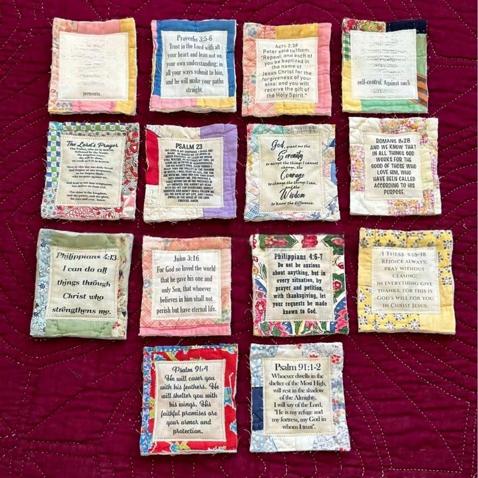 Petit sac moderne en tissu avec croix et mots de bénédiction coutures colorées pour la prière d'anniversaire et l'utilisation rituelle
