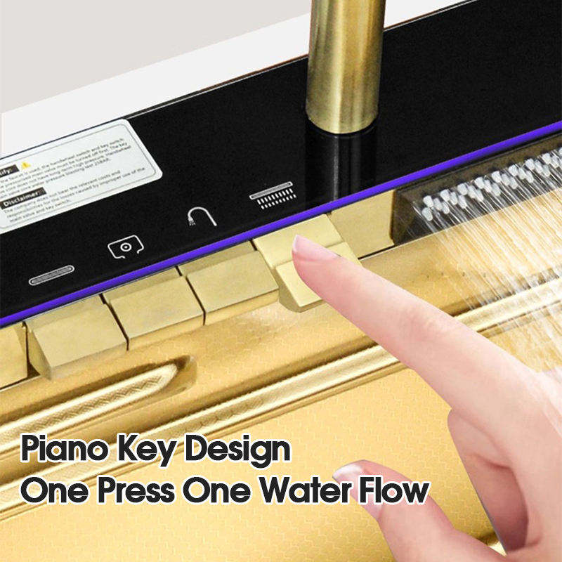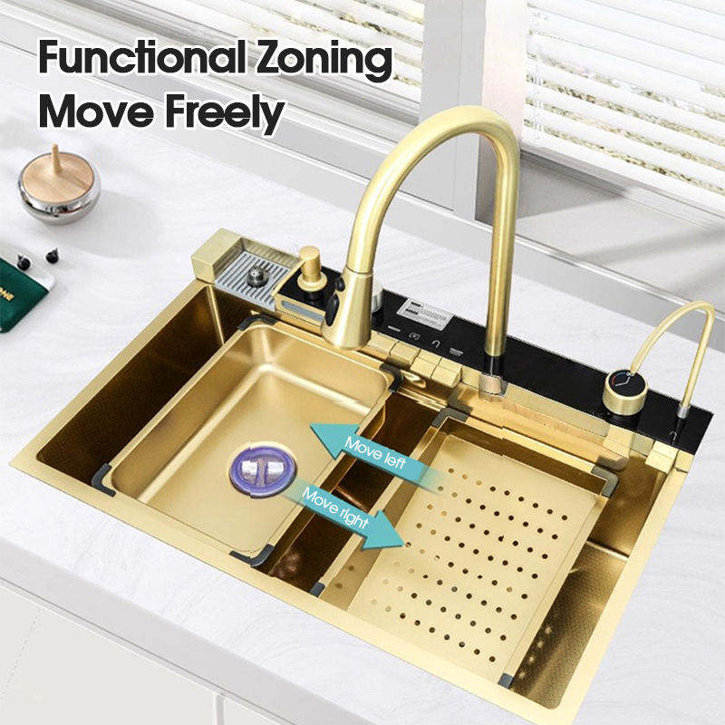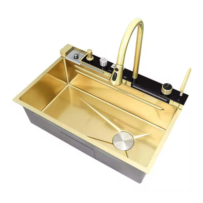 Évier de cuisine intelligent moderne avec affichage numérique LED, robinet cascade, en acier inoxydable 304, cuve simple intégrée