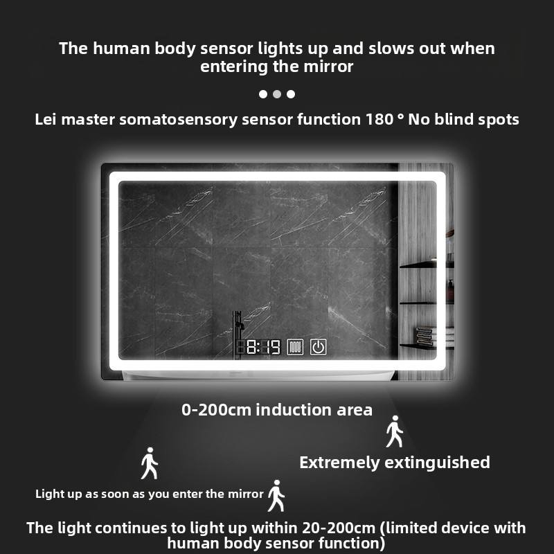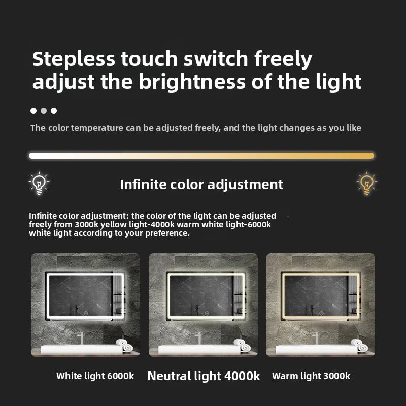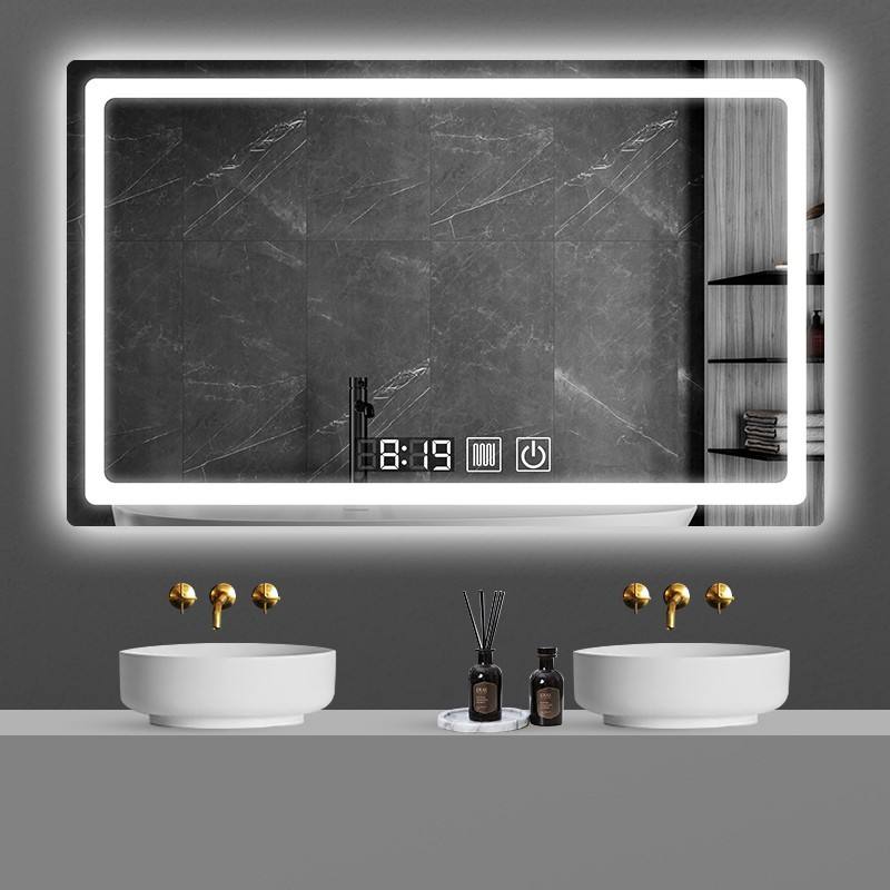 Miroir de salle de bain mural intelligent LED moderne anti-buée, forme rectangulaire, écran tactile, verres éclairés, hôtel, villa