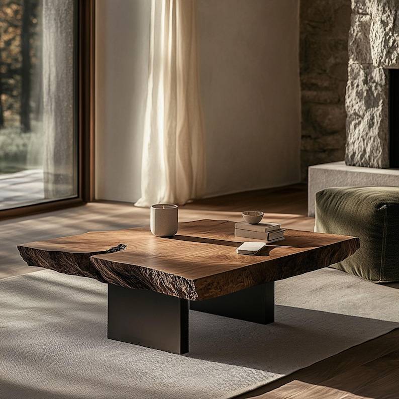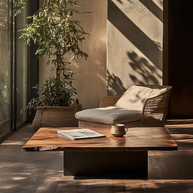 Table basse moderne en teck massif, design épuré, finition naturelle, écologique, construction durable, fabrication artisanale, meuble de maison pratique