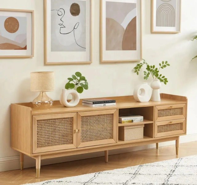 Buffet moderne en teck massif avec portes en rotin, design scandinave minimaliste, armoire de rangement pour salle à manger et hôtel, écologique et durable