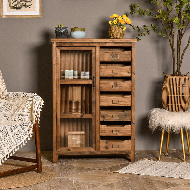 Meuble de rangement de salon moderne en bois massif avec plusieurs tiroirs et portes en verre, bar à domicile
